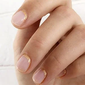 Materialízala con… Trabaja el fondo con una capa de base, otra del rosa transparente Mademoiselle de essie y, por último, añade el toque glam con un pincel fino mojado en el tono dorado Penny Talk. Solo tendrás que seguir la forma del nacimiento de tus uñas para conseguir el acabado de la imagen.